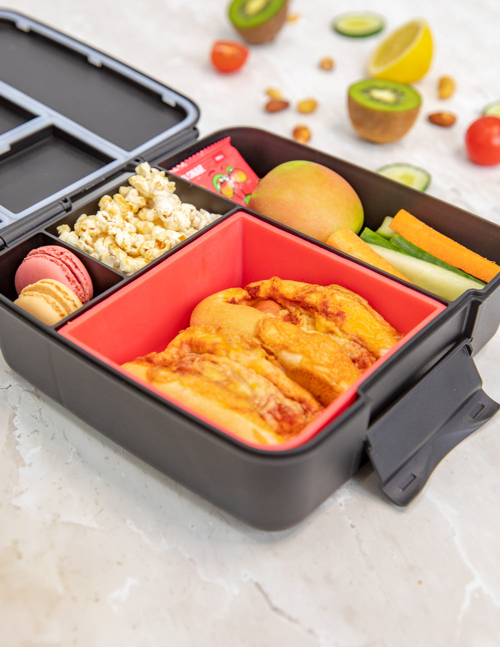 Colourful bento lunch box with various food items on a white background